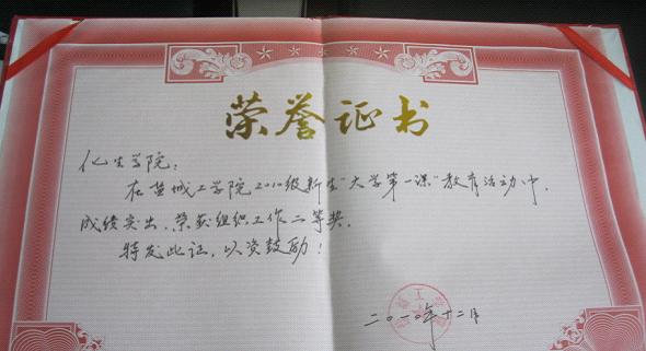 公司2010级新生在大学第一课教育活动中荣获组织工作二等奖