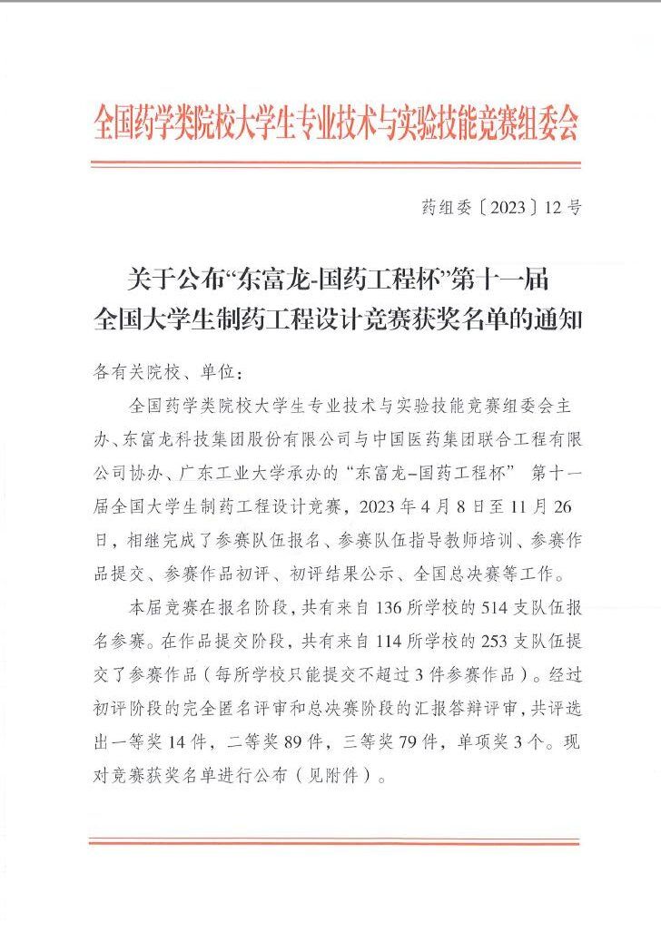 近日,由全国药学类院校老员工专业技术与实验技能竞赛组委会主办、东富龙科技集团股份有限公司与中国医药集团联合工程有限公司协办、广东工业大学承办的“东富龙-国药工程杯”第十一届全国老员工制药工程设计竞赛圆满落幕。本次竞赛以“生物制品CDMO无菌制剂车间工艺设计”为题,设计范围为年产生物制品冻干粉针剂200万支和年产生物制品小容量注射剂1500万支制剂车间。设计要求除满足药品生产质量管理规范(GMP)外,还需考虑在车间布局中留有参观空间。全国共有136所学校514支队伍报名参赛,其中114所学校253支队伍提交了参赛作品。