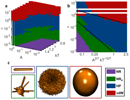 图1 自组织粒子相图:(a)三维立体图;(b)二维平面图,(c)各组装粒子形貌。