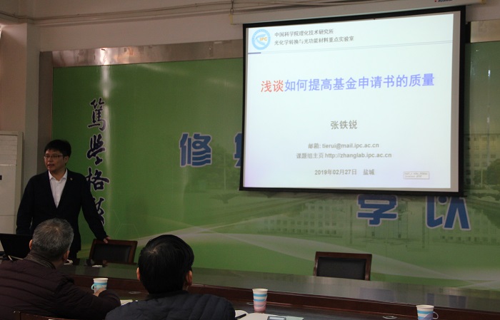 随后,张铁锐研究员作了“浅谈如何提高基金申请书的质量”的报告,对国家自然科学基金申请书的题目、摘要、立项依据、研究内容、研究方案、关键科学问题、研究基础等内容做了详细的介绍。张铁锐研究员勉励申报人员进一步完善凝练申报材料,建议青年教师多参与国内外会议,拓宽视野,加强合作交流。会后张铁锐研究员与化工学院2019年国基申请教师逐一进行交流,提出了宝贵建议。