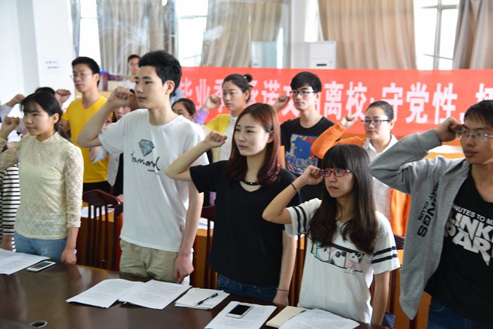 首先,学院负责党建的同学组织毕业生党员在“毕业季,承诺文明离校;守党性,树立党员形象”横幅上签名并留影,在化工131周裕栋带领下重温入党誓词,加深了毕业生党员的责任意识,增强了对党组织的信任与崇敬。