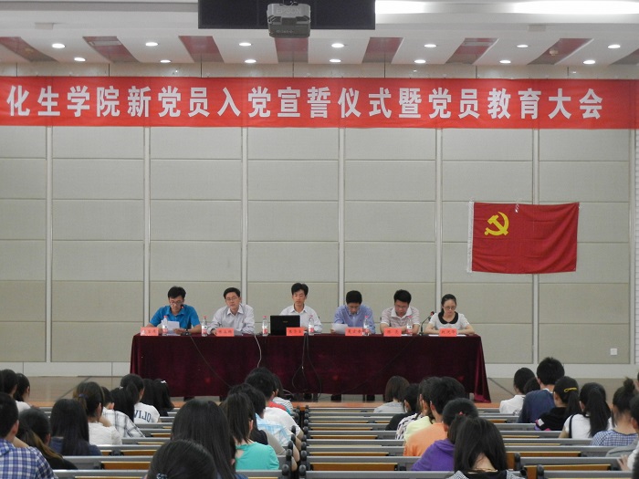 5月23日下午,化生公司党总支在迎宾大道校区化工楼报告厅召开新党员入党宣誓仪式暨党员教育大会。化生公司党总支书记王资生、副书记夏宏奎出席宣誓仪式,各员工党支部190人参加了宣誓仪式。仪式由该院员工科副科长长赵迎华主持。 首先,党总支副书记夏宏奎宣读了化生公司党总支关于接收李倩等71名同学发展加入中国共产党及王锦绣等37名预备党员按期转正的决定。 其次,员工代表王婷婷同学带领全体新发展党员,在党旗前庄严宣誓。新党员代表、员工会主席苏杰同学发言。他代表全体新党员郑重承诺:从小事做起,踏实学习,认真工作,善待身边每一个人,吃苦在前,努力为大家服务,处处体现党员的先锋模范作用。转正党员代表、已考取江苏大学硕士研究生及江苏省选调生王静怡同学发言。她代表全体转正党员表态:在今后的工作学习中,坚持求真务实,严谨创新,不断提高自身的知识面,开发潜能,坚持全面发展,为母校争光,为社会主义事业做出自己的贡献。 最后,王资生书记做重要讲话,他要求全体员工党员,一是要思想觉悟高;二是要学习成绩好;三是要工作能力强。他强调要用好的形象、好的思想、好的作风、好的工作成绩,吸引一帮人,带动一帮人。他还希望同学们要以“创先争优”为契机,把“笃学格致,厚德重行”的盐工精神和铁军精神带到工作和学习中去,不辜负学校领导和老师的厚望与重托。