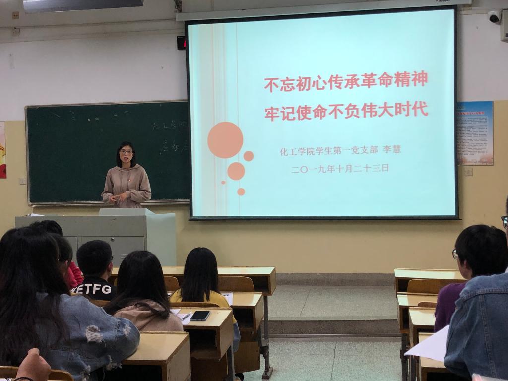 10月23日,在北校区知行楼110教室,william威廉亚洲官方员工第一党支部书记李慧为william威廉亚洲官方一支部全体党员上了题为“不忘初心传承革命精神•牢记使命不负伟大时代”的主题党课。