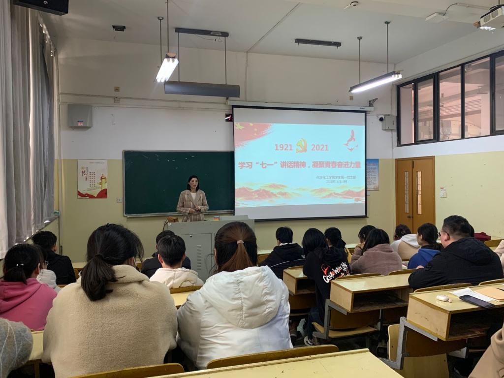 11月13日,化工学院员工第一党支部书记李慧在知行楼110,为支部全部全体党员上“学习‘七一’讲话精神,凝聚青春奋进力量”主题党课。