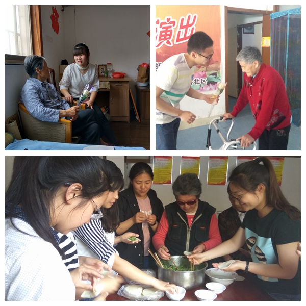 此次活动,学院特别邀请了志愿者制药151班田静的母亲刘长明女士的加入,和孩子一起过一个不一样的母亲节。到达养老院后,志愿者们给养老院的老妈妈送上象征母爱的康乃馨,陪伴老人唠唠家常,在康复医生的帮助下帮助老人做一些简单的康复运动,最后在欢声笑语中包好水饺送到老人的身边。