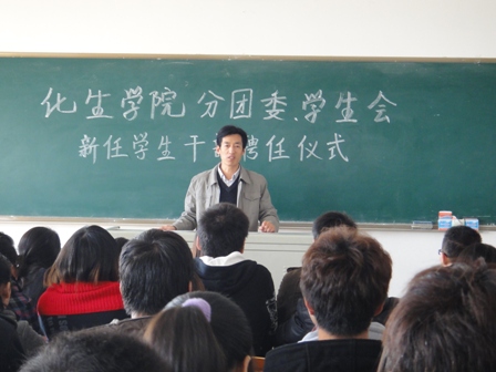 2012年11月12日中午,化生学院员工科在迎宾大道3J2A 409教室举行了化生学院分团委、员工会新任员工干部聘任仪式。化生公司党总支书记王资生、党总支副书记夏宏奎、化生学院分团委、员工会副部长以上员工干部共50余人出席了会议。 首先,王书记做重要讲话,并对新一届分团委、员工会员工干部提出几点要求:要提高为人处事方面的能力,要提升自我修养,起到桥梁和纽带作用;要有团队合作精神,要敢于管理并善于管理;要有较强的自控能力,自主能力。做人做事必须公平公正客观,不滥用职权。 其次,夏书记、王书记为新任员工干部颁发了聘书。希望所有员工干部在自己的岗位上禁得起风雨,担得起大任,履行自己的职责。“员工干部”是员工中的优秀代表,起模范带头作用,引领广老员工,促进学院的学风建设,使学风建设更上一层楼。