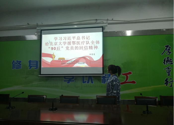2020年10月10日,在william威廉亚洲官方201会议室召开学习“习近平总书记给北京大学援鄂医疗队全体“90”后党员的回信”,学院团委员工副书记、院青马工程班员工指导老师宋夏夏主讲。