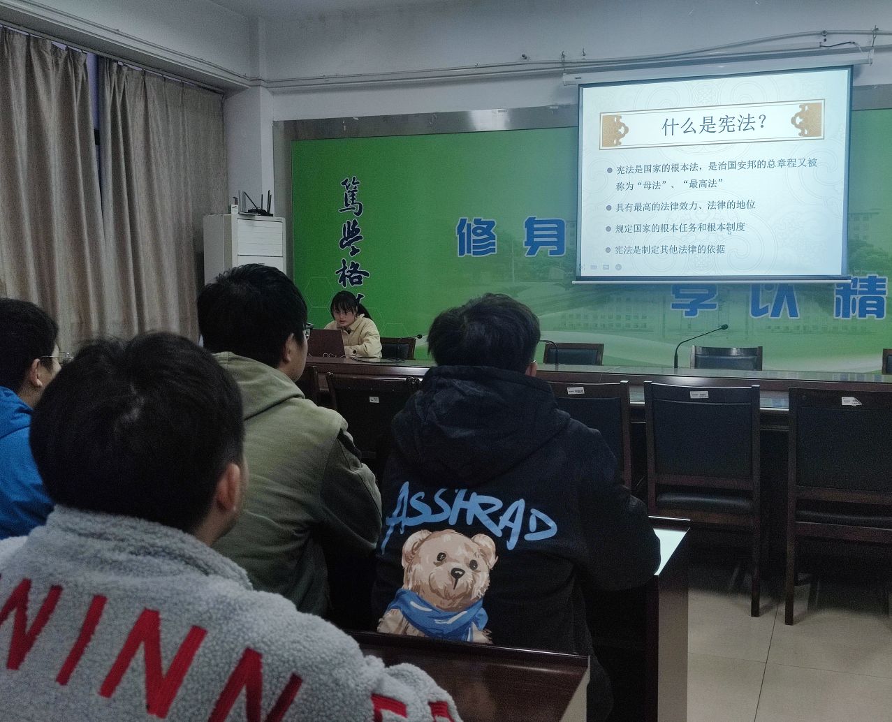 本次活动分为三个部分,第一部分是向全体与会同学们播放两个宪法宣传视频,第一个视频讲述了《82宪法》陪伴了一代人长大,影响了他们的一生,随之宪法精神又被传递给了下一代,第二个视频则通过动画的形式,言简意赅的向同学们介绍了宪法是我们“最亲密”的朋友,从我们诞生那一刻开始,宪法就与我们有了千丝万缕的关联并且伴随着我们的一生,保障我们应有的基本权利;第二部分是邀请同学们分别从生活、学习和工作中分享自己对宪法的认识;第三部分是通过PPT向大家更进一步宣传宪法,介绍宪法的来源以及发展历程,同时强调宪法是我国的根本法,是治国安邦的总章程。