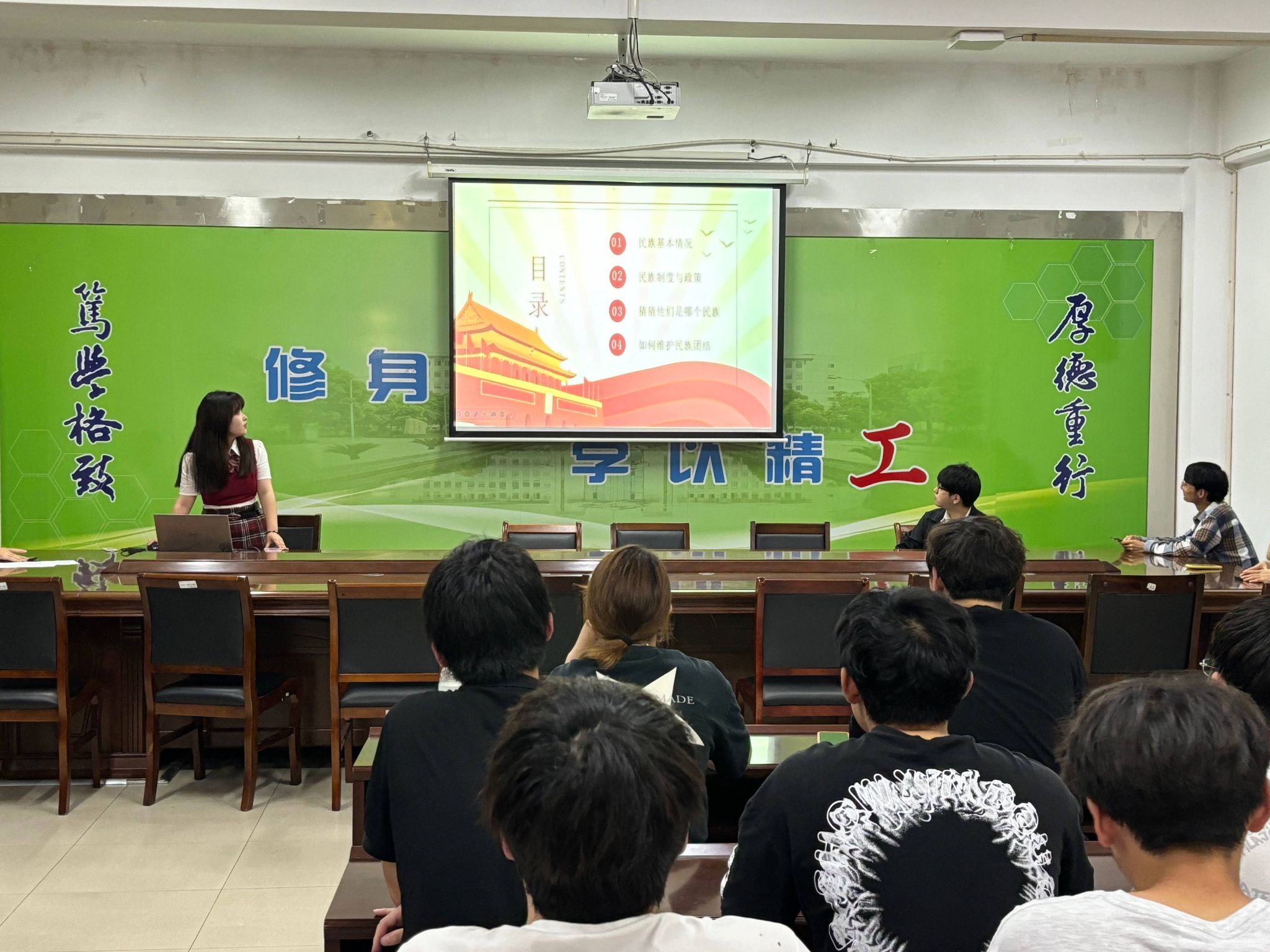 活动开始,团委员工干部方艳燕,通过精心准备的PPT从我国民族基本情况、民族制度与政策、如何维护民族团结等方面向同学们进行了讲解,深入了解了各民族的传统节日、习俗、服饰以及美食,通过生动的故事讲述和图片视频展示,让在场每位同学仿佛身临其境,深切感受到了中华文化的博大精深和民族多样性的独特魅力。通过现场的互动有效提升了同学们参与兴趣与参与度,激发了同学们对民族团结事业的热情与责任感,鼓励青年一代成为民族团结的使者,并为后续的互动讨论和实践活动奠定了坚实的基础。
