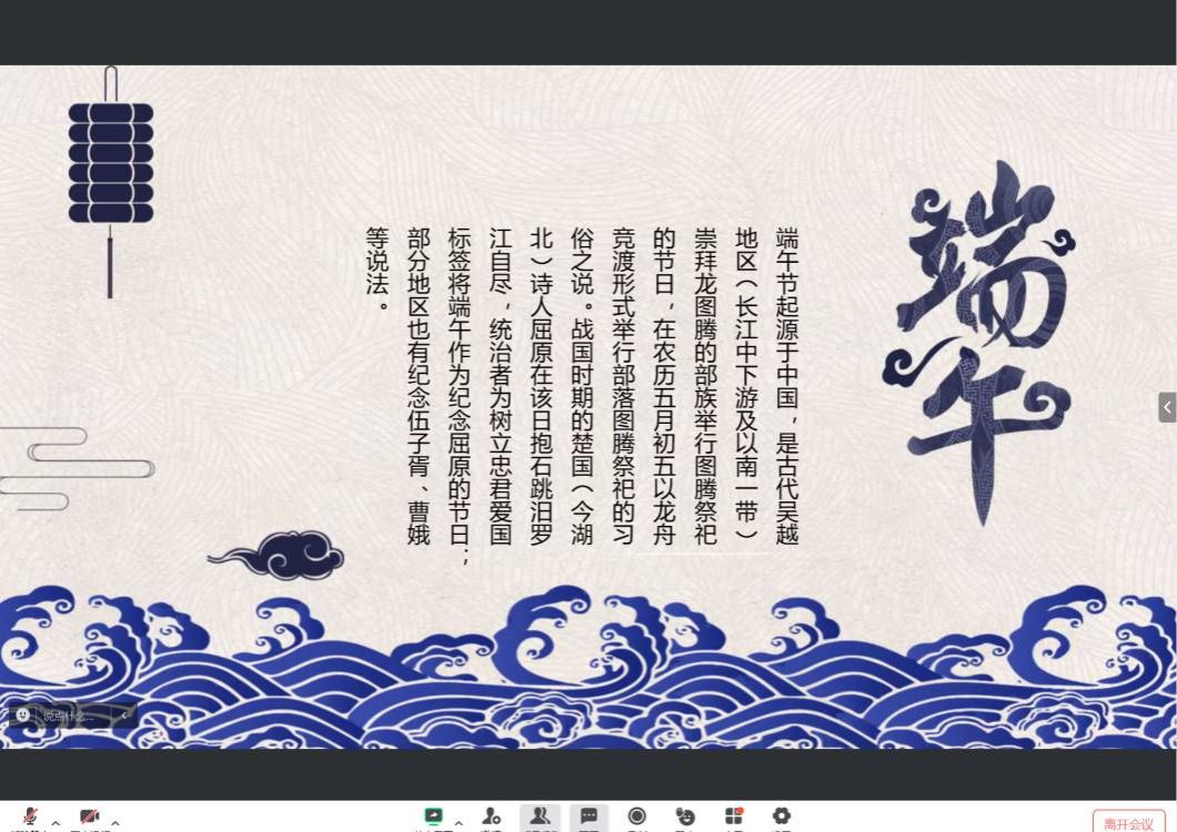 为了提高同学们对端午习俗的认知,增强对传统文化的认同感和对民族文化的自豪感,william威廉亚洲官方团委于6月10日晚上,组织团委全体员工干部在线上开展“品味端午,传承文化”的主题活动,共计60余人参加。