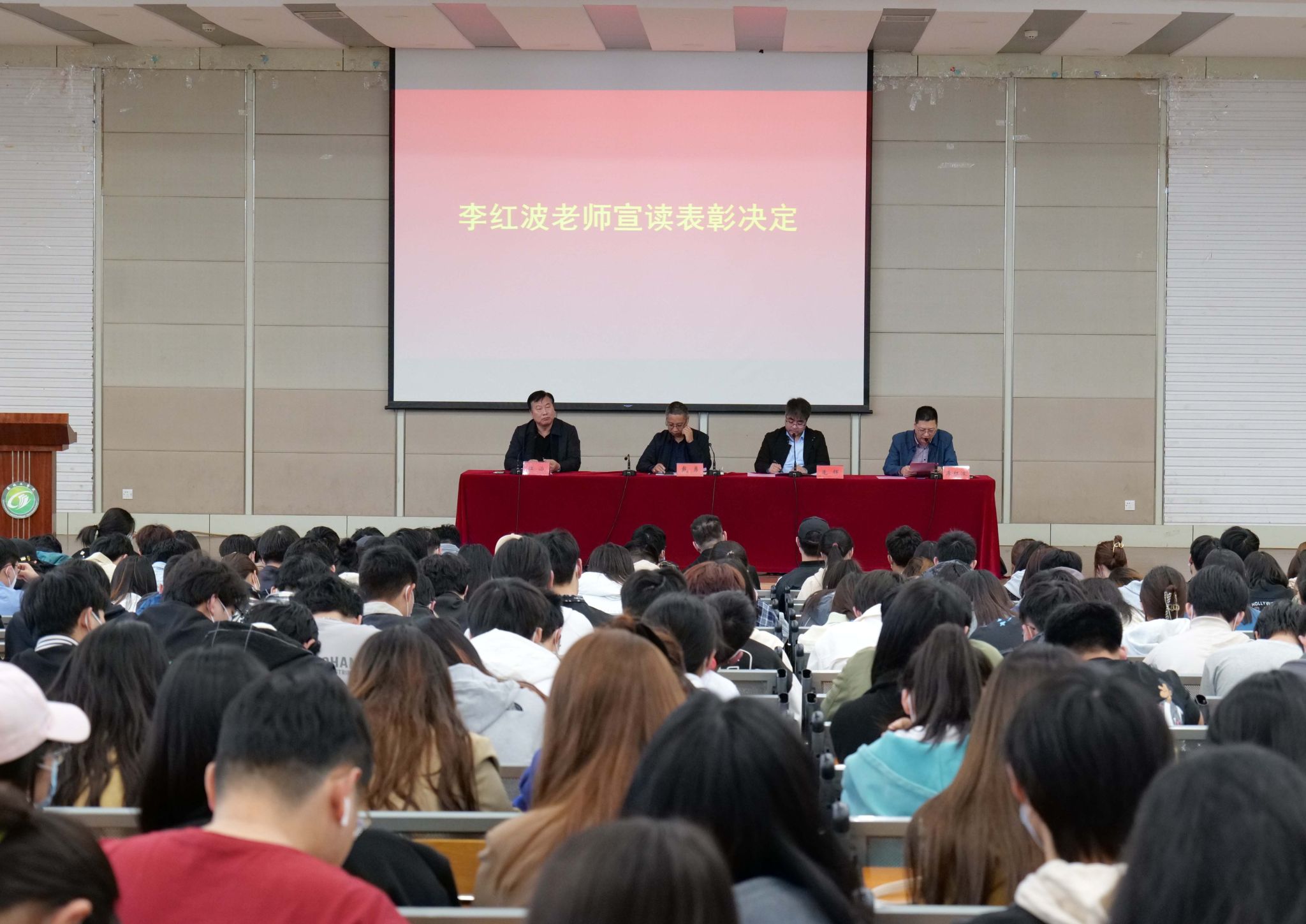 李红波宣读了《关于表彰2022-2023学年国家奖学金获得者的决定》、《关于表彰2023年度省级三好员工、优秀员工干部和先进班集体的决定》、《关于表彰2022年度学科竞赛先进个人的决定》和《关于表彰2023年度考取硕士研究生员工的决定》。