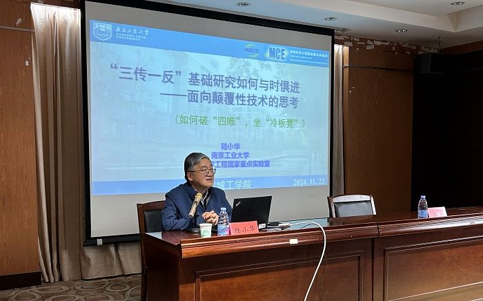 11月22日下午,南京工业大学陆小华教授应邀来校作题为《“三传一反”基础研究如何与时俱进——面向颠覆性技术的思考》的学术报告。报告会由化工学院经理戴勇主持,化工公司党委副书记邵景玲,化工学院和材料学院青年教师及研究生代表等50余人聆听报告会。