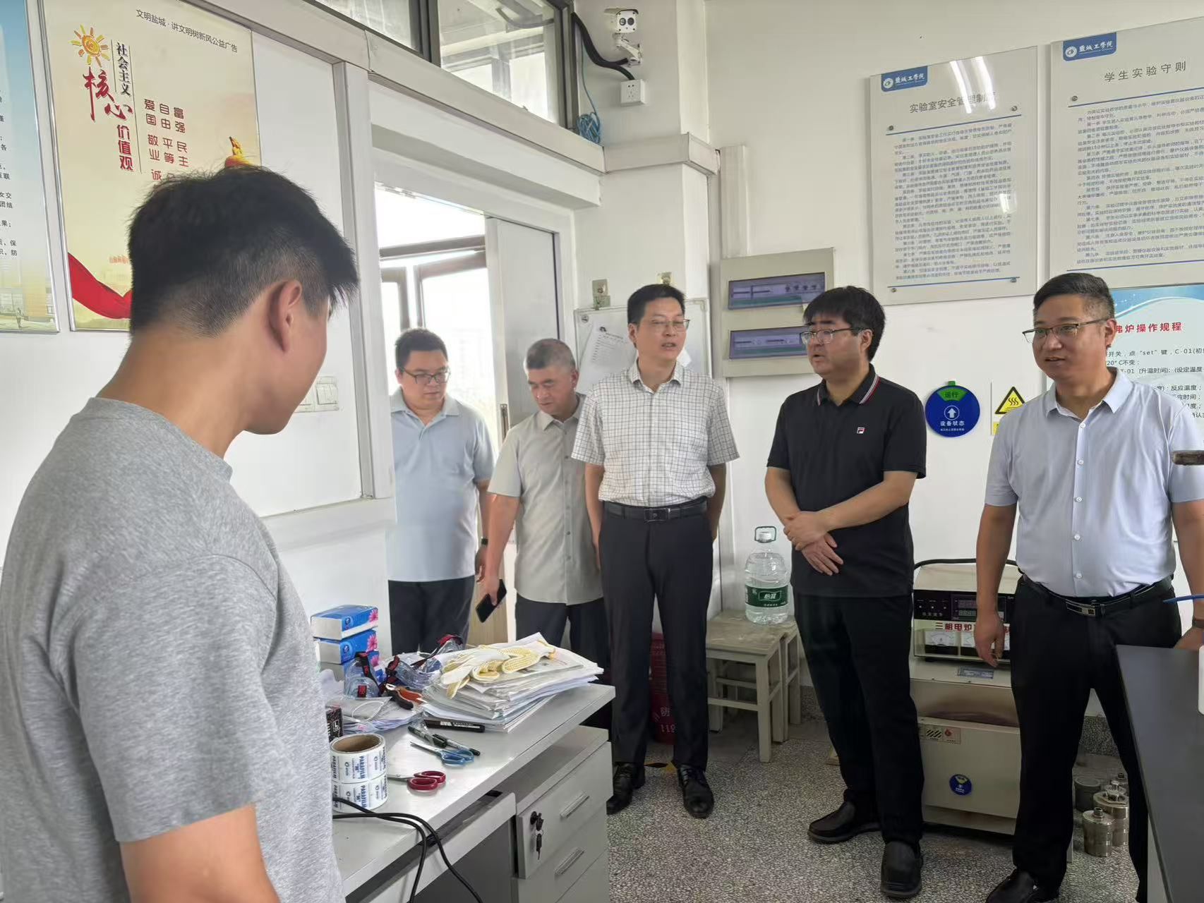 公司领导老师首先走访检查实验室,询问了解实验室开放使用、人员管理、值班值守及危化品使用管理等安全责任落实情况,同时叮嘱师生要时刻紧绷安全这根弦,提高安全意识,明确安全责任,严格遵守实验室规章制度,切实保障暑期实验室安全平稳运行。学院领导看望了正在实验室学习工作的师生,关心了解师生在校生活、学习、科研等情况,重点询问2026届研究生科研工作进度以及在科研工作中遇到的困难,鼓励大家充分利用假期潜心钻研,力争产出更多高质量成果。