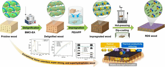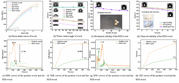 文章提出“分层强化、协同增效”策略,通过“阻燃浸渍—热压强化—无胶自固”协同工艺,制备出多性能协同优化的改性木材(RDS-wood)。该材料具备高效阻燃性、优异力学性能和超疏水自清洁能力,可满足高端应用场景需求。