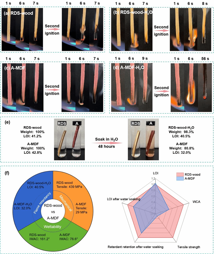 Fig. 3 Images of burning, water-soaking tests, and comparative analysis of A-MDF and RDS-wood.