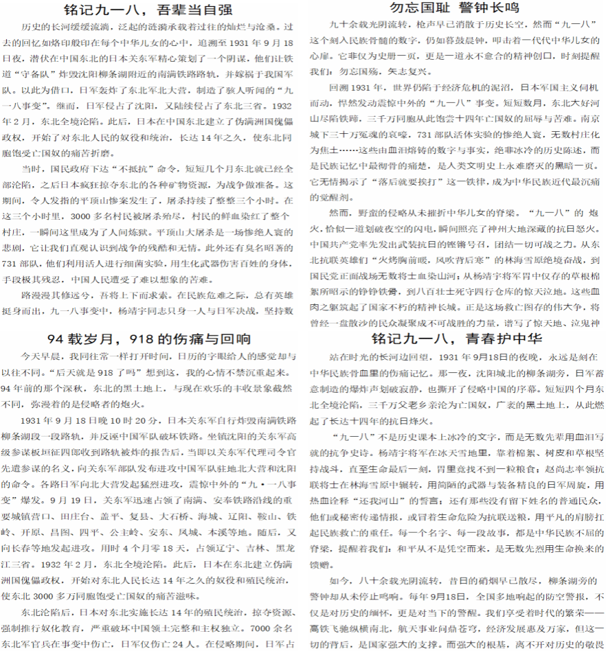 9月16日至18日,学院团委举办“铭记九一八,吾辈当自强”主题征文活动。活动共征集文章60余篇,以“个人”“国家”的关系为视角,围绕抗日战争历史故事诉说、党史发展回溯等内容,将爱国之情转化为强国之志、报国之行。通过撰写征文,同学们再度回顾了“九一八”事变的历史,牢记了国耻,增强了历史责任感,进一步展现了当代老员工把实现自身价值与报效祖国的历史责任感和高尚的价值追求。
