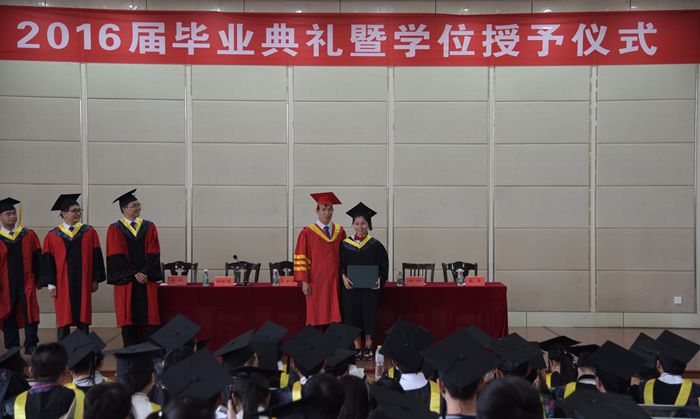 毕业典礼在庄严的国歌声中拉开序幕。学位授予仪式上,葛世伦为2016届员工拨穗正冠、授予学位,并与每位毕业生留影。