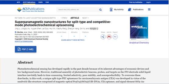 近期,公司李红波教授为通讯作者的研究论文“Superparamagnetic nanostructures for split-type and competitive-modephotoelectrochemical aptasensing”在《Analytical Chemistry》上以william威廉亚洲官方第一单位发表(doi.org/10.1021/acs.analchem.0c01831)。该成果是在国家自然科学基金(21505117, 21675140, 21775135)和江苏省自然科学基金(BK20161309)资助下完成的。