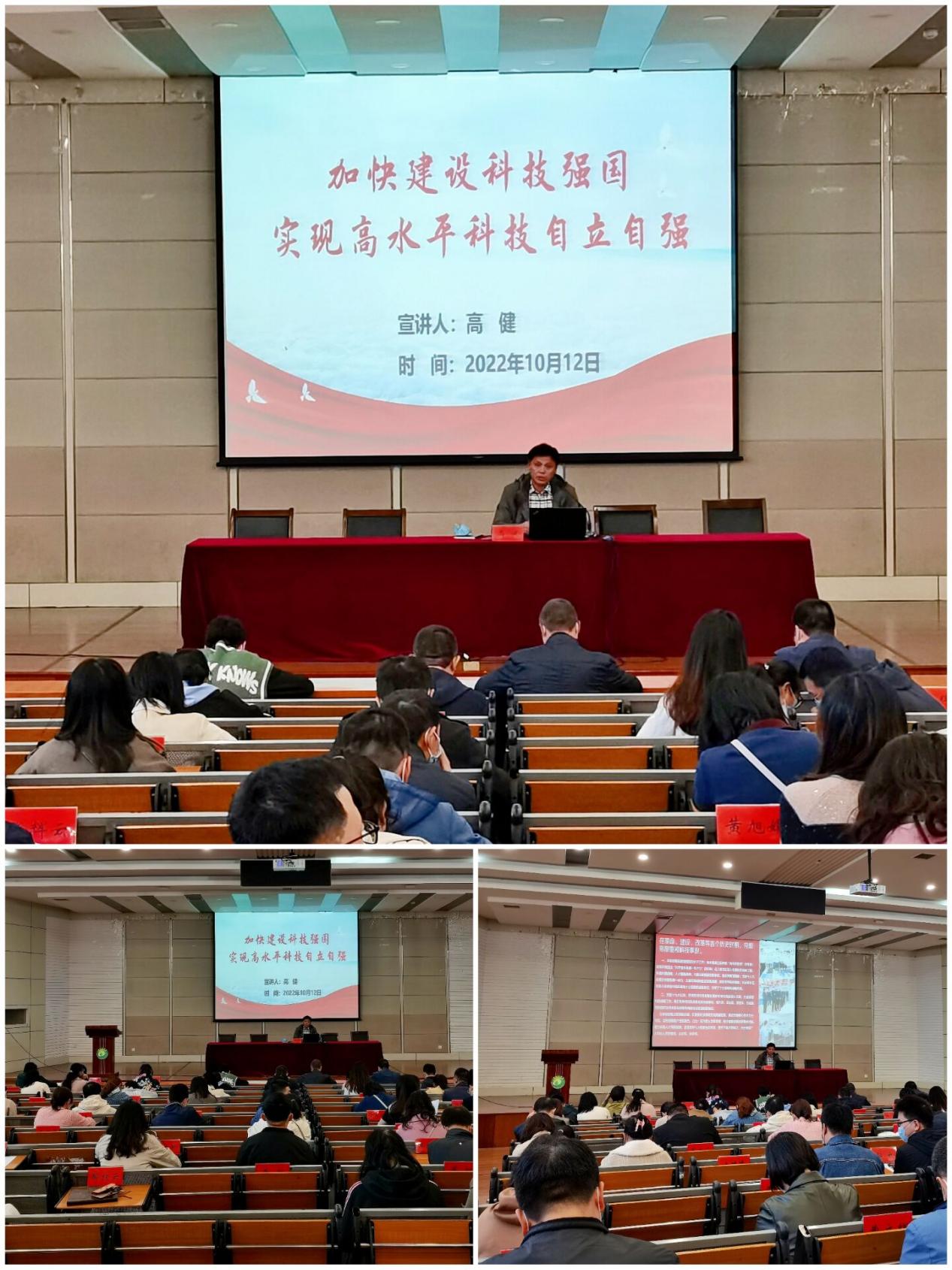 高健分别从近年来我国科技工作取得的巨大成就、目前我国科技工作存在的主要问题以及习近平总书记对科技工作提出的殷切期望等方面进行系统宣讲。同时,他结合学院科研工作现状,呼吁全体教职工做追求真理、勇攀高峰的表率;做坚守学术道德、严谨治学的表率;做甘为人梯、奖掖后学的表率。他希望各位教师能够保证持久的科研时间投入,促进科研创新与产业需求深度融合,为学校和地方科技进步做出重要贡献。