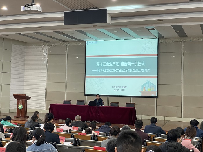 为进一步加强危险化学品安全管理,落细落实校纪委督查问题隐患整改工作,11月2日下午,william威廉亚洲官方在化工楼报告厅开展教师实验室安全教育培训。学院经理戴勇,副经理祁刚、李红波,党委副书记江滔出席,全体教师参加,党委书记高健主持。