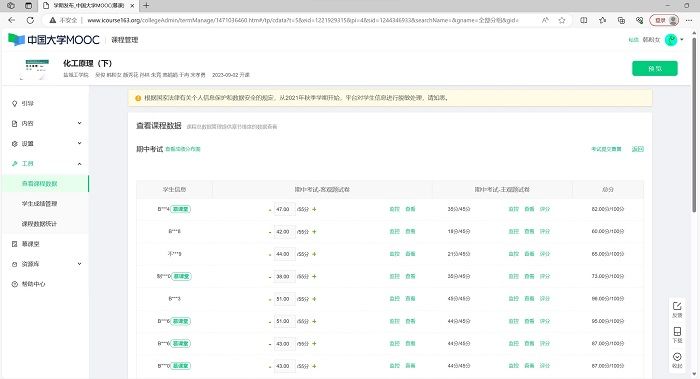 组织理论课程期中考试。为加强课程过程考核,检验前期课堂教学效果,明确持续改进方向,切实提高课程教学质量,学院安排两门国家一流本科课程《化工原理》、《无机及分析化学》作为期中考试课程,并提供完整的课程教学材料和考核材料等线上学习资源。本次期中考试安排线上考试,学院2021级、2023级本科生共631人参加本次考试,考试及格率达90%以上,期中考试成绩按比例计入课程总评成绩。